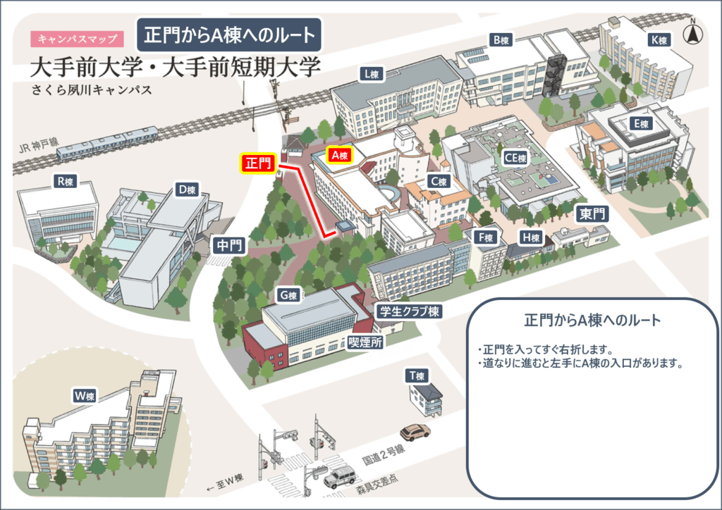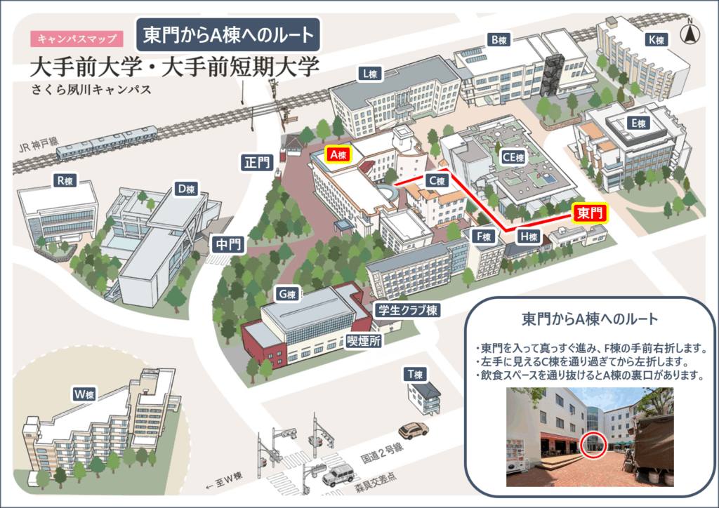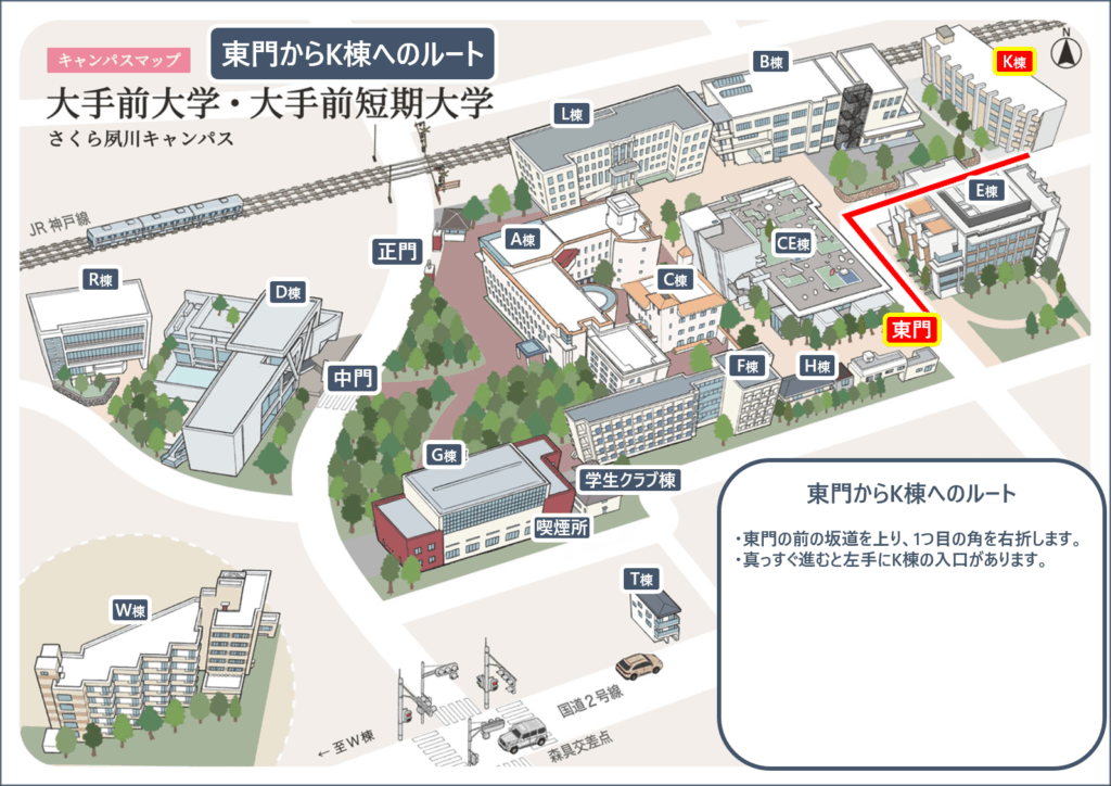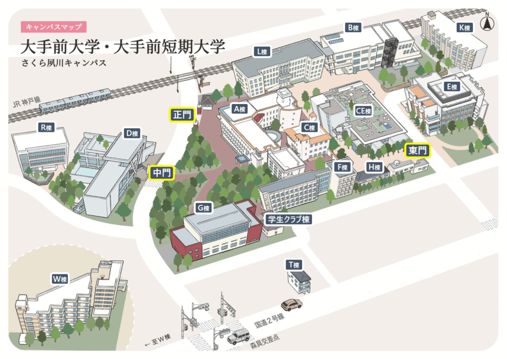 大手前大学 さくら夙川キャンパス 2025.05.22 目次 キャンパスマップ各棟へのルート案内A棟へのルート正門からA棟中門からA棟東門からA棟E棟へのルート正門からE棟中門からE棟東門からE棟K棟へのルート正門からK棟中門からK棟東門からK棟喫煙所へのルートA棟から喫煙所E棟から喫煙所K棟から喫煙所 キャンパスマップ 試験教室/会場本部 を確認する 各棟へのルート案内 A棟へのルート 正門からA棟 中門からA棟 東門からA棟 E棟へのルート 正門からE棟 中門からE棟 東門からE棟 K棟へのルート 正門からK棟 中門からK棟 東門からK棟 喫煙所へのルート A棟から喫煙所 E棟から喫煙所 K棟から喫煙所