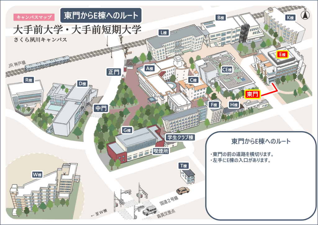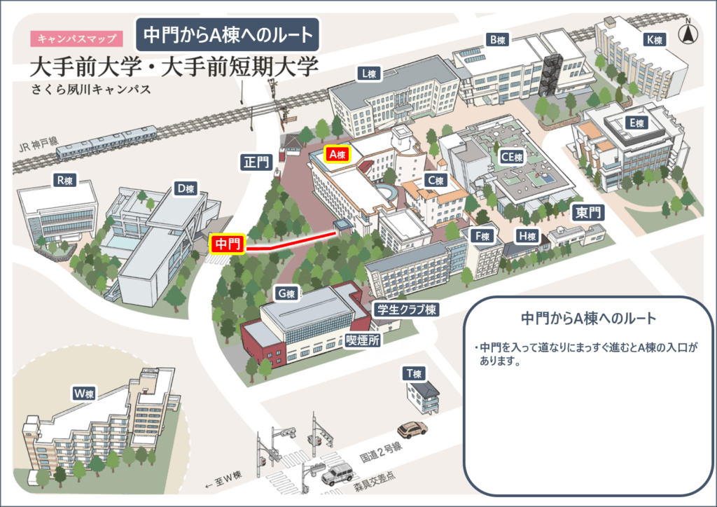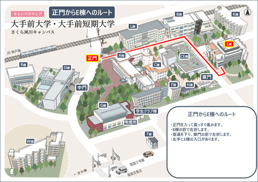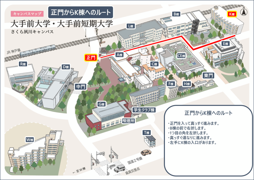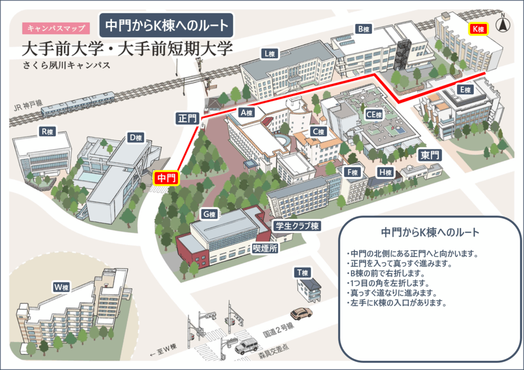 大手前大学 さくら夙川キャンパス 2025.05.22 目次 キャンパスマップ各棟へのルート案内A棟へのルート正門からA棟中門からA棟東門からA棟E棟へのルート正門からE棟中門からE棟東門からE棟K棟へのルート正門からK棟中門からK棟東門からK棟喫煙所へのルートA棟から喫煙所E棟から喫煙所K棟から喫煙所 キャンパスマップ 試験教室/会場本部 を確認する 各棟へのルート案内 A棟へのルート 正門からA棟 中門からA棟 東門からA棟 E棟へのルート 正門からE棟 中門からE棟 東門からE棟 K棟へのルート 正門からK棟 中門からK棟 東門からK棟 喫煙所へのルート A棟から喫煙所 E棟から喫煙所 K棟から喫煙所
